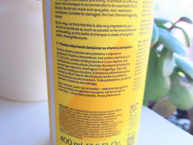 Vasario mėnesį mane labai nustebino Biok komandos dovana - nauja KILIG Vitamin Bomb produktų linija, skirta plaukų priežiūrai. Man patinka KILIG Vitamin Bomb produktų linijos dizainas, geltona spalva ne tik džiugina akį, bet ir pakelia nuotaiką, džiugu, jog produktų pakuotės yra pilnai perdirbamos ir taip draugiškesnės aplinkai.
