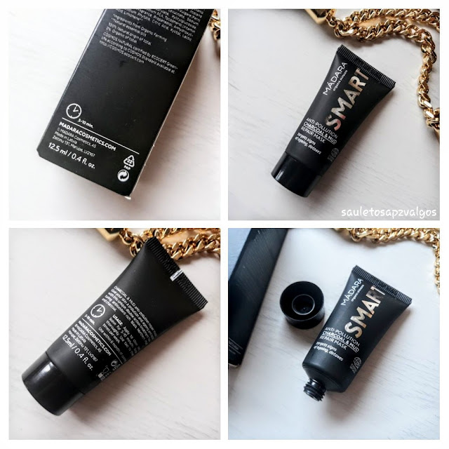 MADARA Smart Anti-Pollution Charcoal & Mud Repair Mask - atkuriamąją veido kaukę radau vienoje iš Lookfantastic grožio dėžučių. Turiu mėginuko dydžio kaukės pakuotę (12,5 ml.). Veido kaukė atkeliauja juodos spalvos pakuotėje. Ant įpakavimo yra nurodoma trumpa informacija apie produktą.